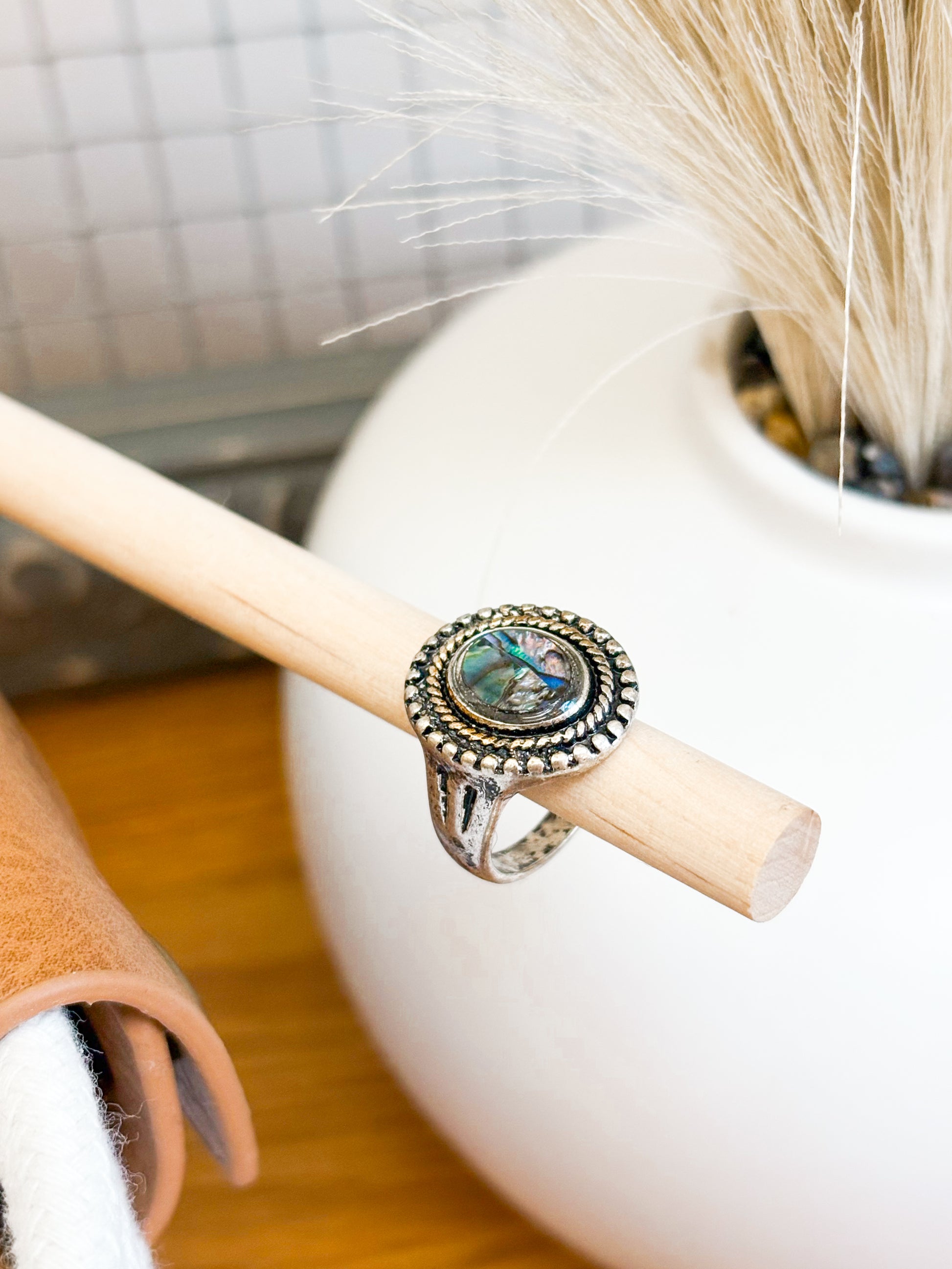 This ring has a thin band with a beautiful abalone stone in the center, surrounded by a chain design with intricate detail. This ring has a black rustic design that adds texture and character. This ring is a size 6.5.
