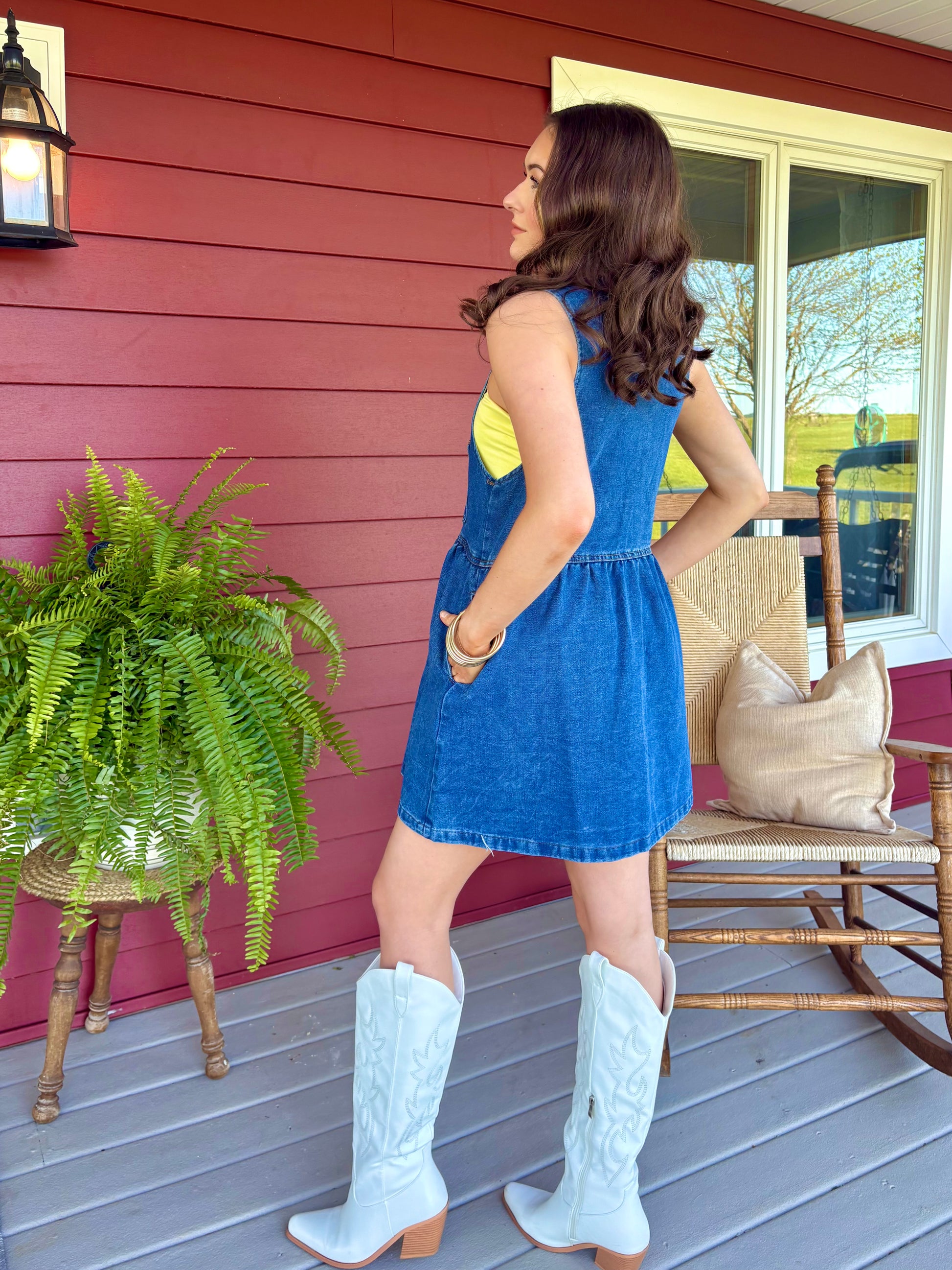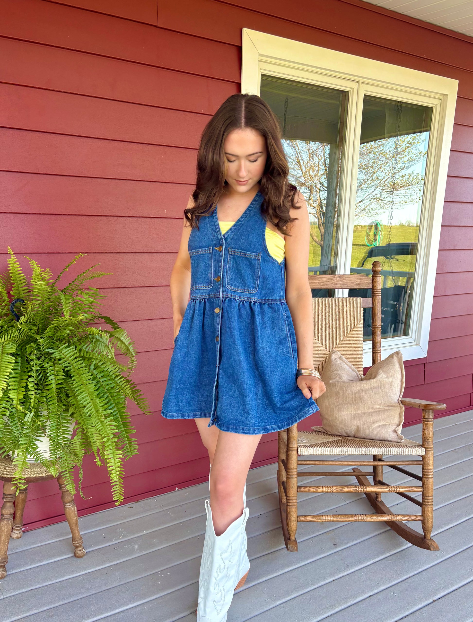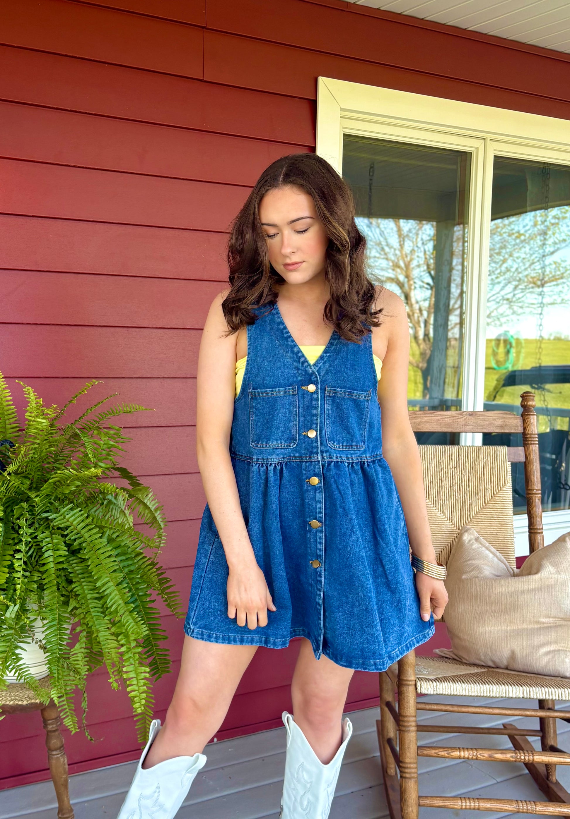 This dress is perfect for any season, whether you want to layer for the colder seasons or wear simple for the warmer weather if it very versatile! This dress has gold buttons up the front and has pockets!