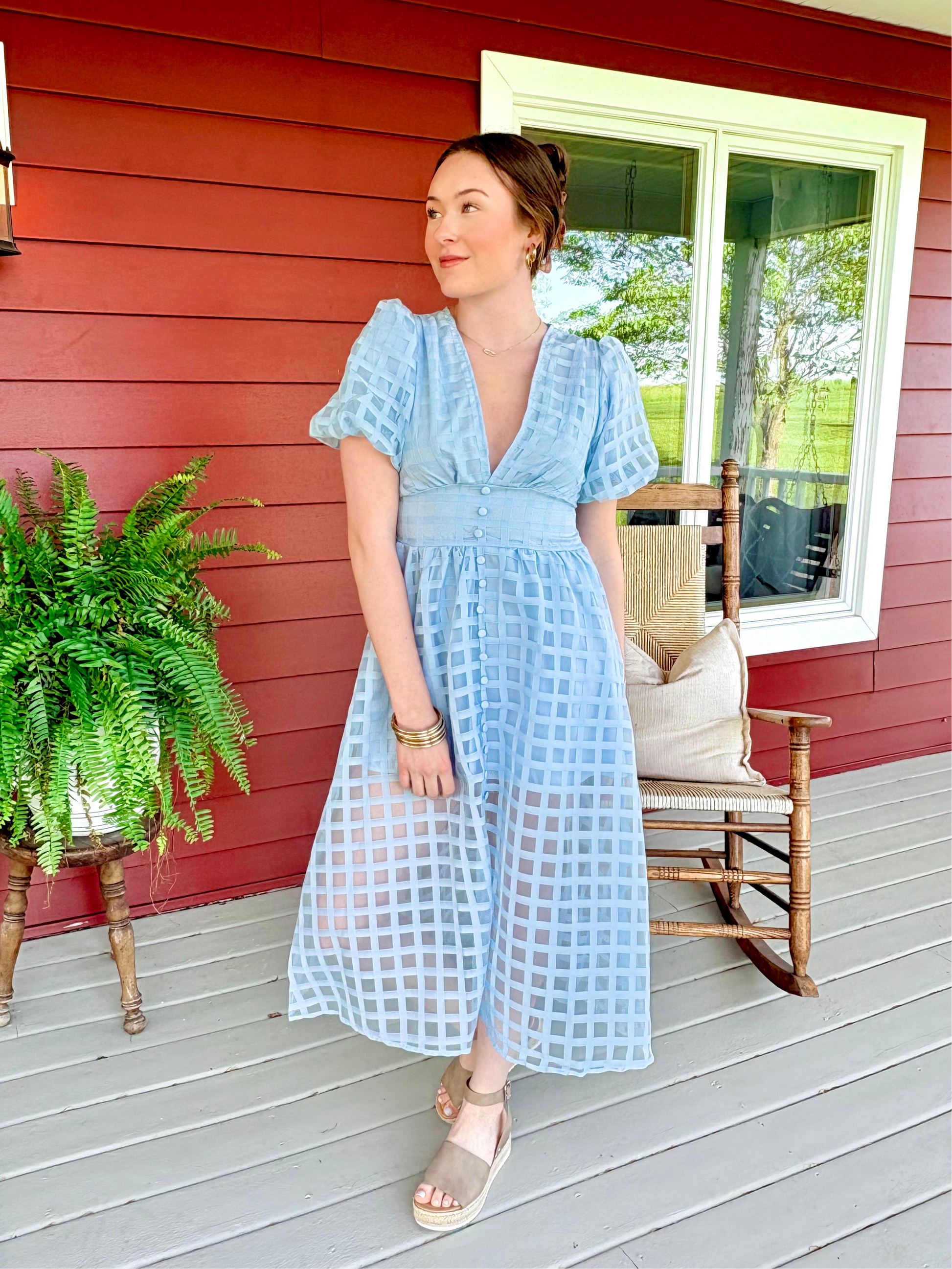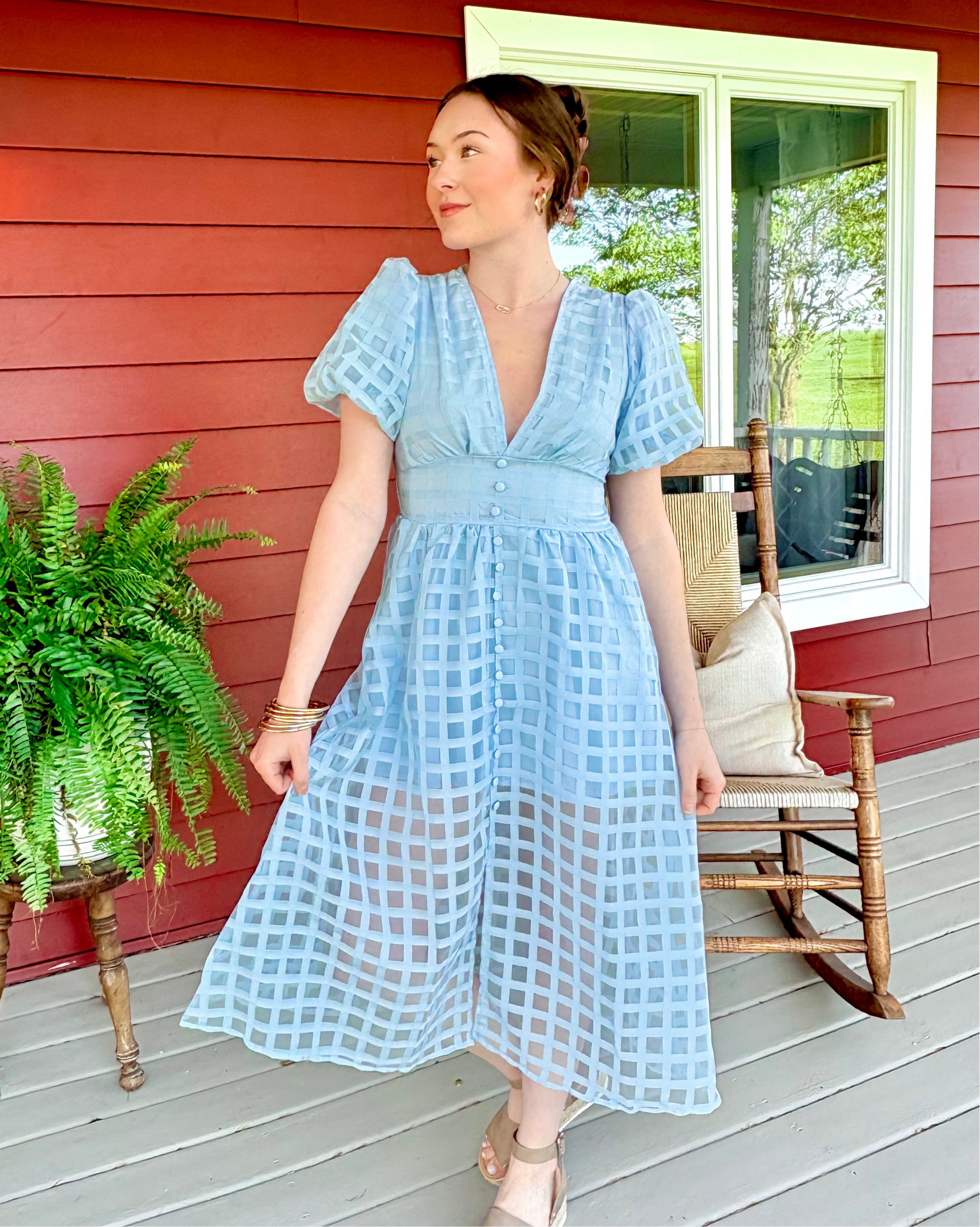 This dress features a blue gingham design, with puff sleeves and a button down front closure. There is a shorter slip underneath and a slit front design.