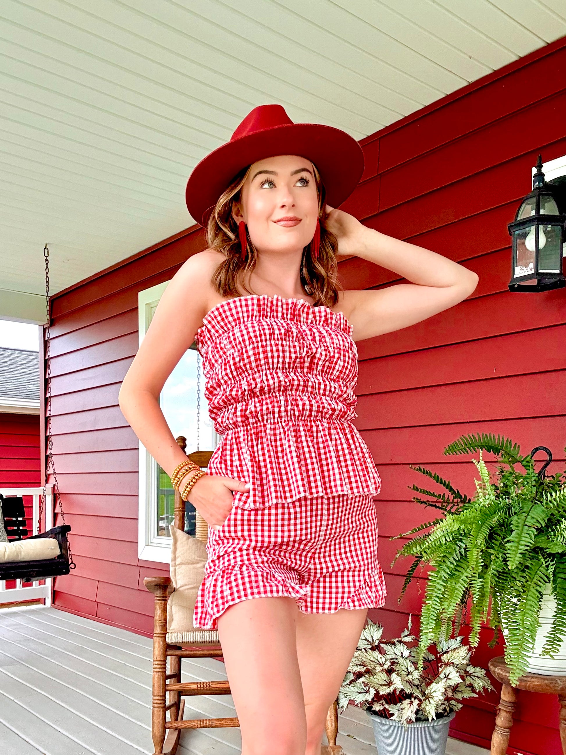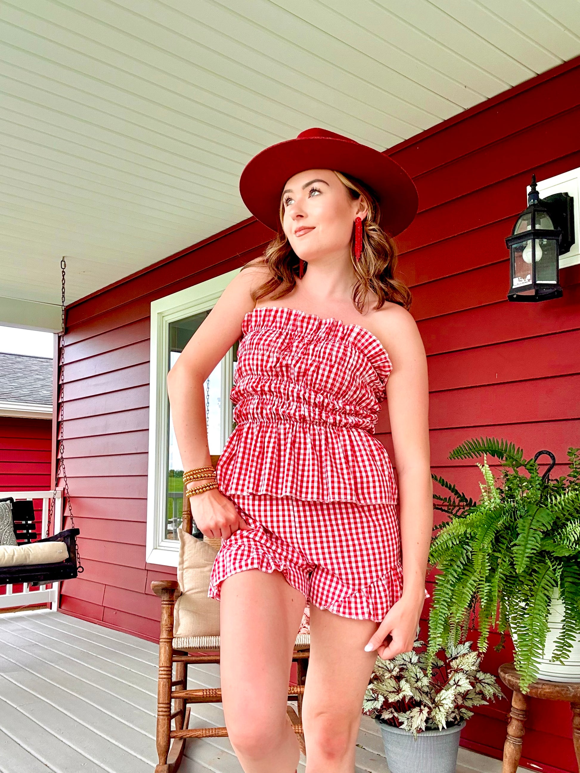 This top has a strapless design with a ruched bust and a ruffled bottom. This top is very stretchy featuring a red and white gingham pattern.