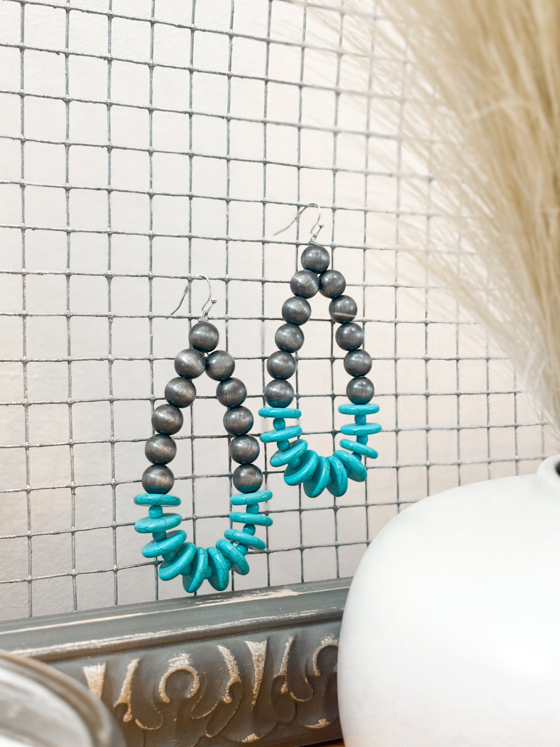 These turquoise and pearl hoop dangle earrings are so beautifully designed. These earrings be a great statement piece to pair with a nice western outfit for a night out on the town.