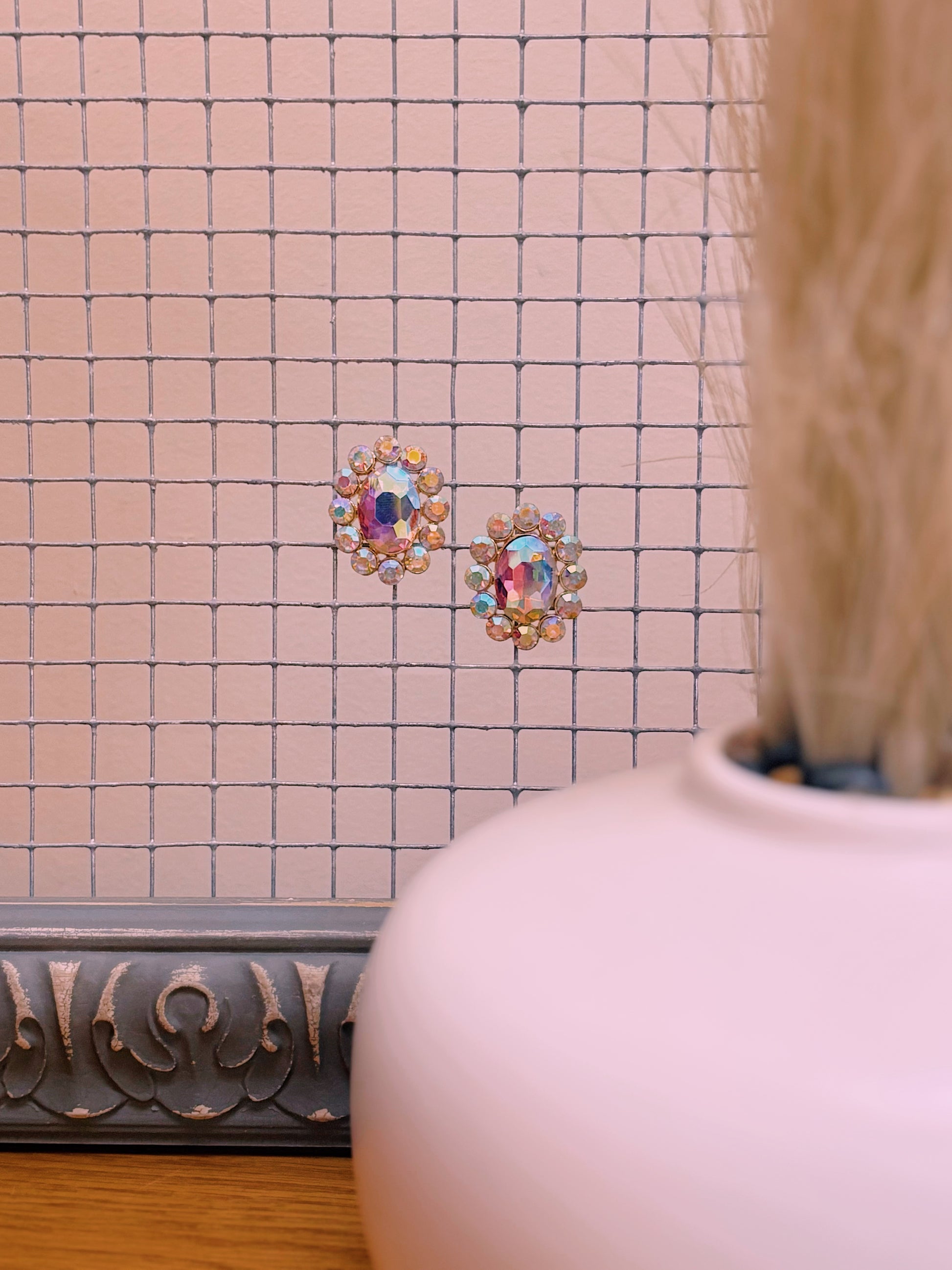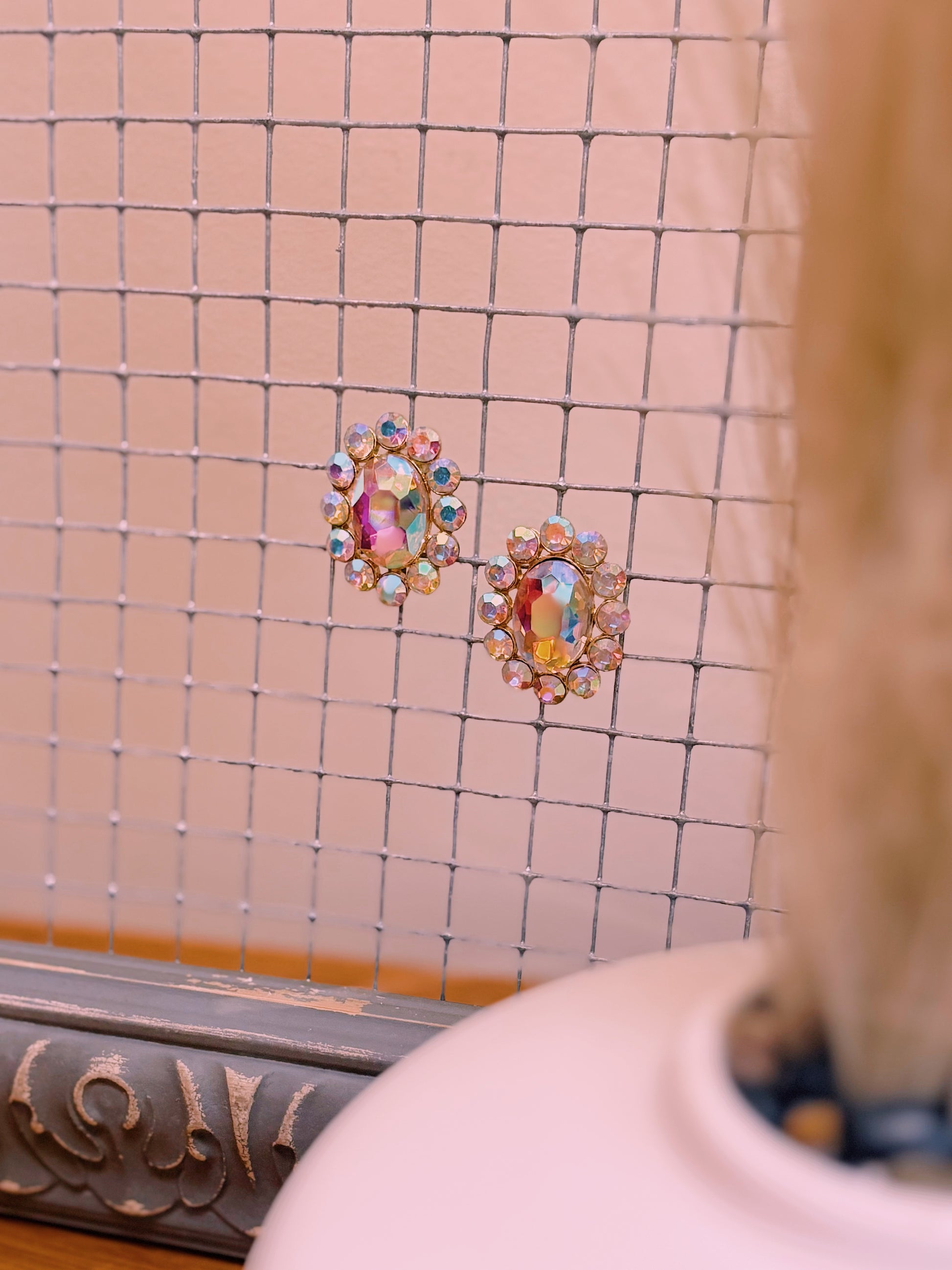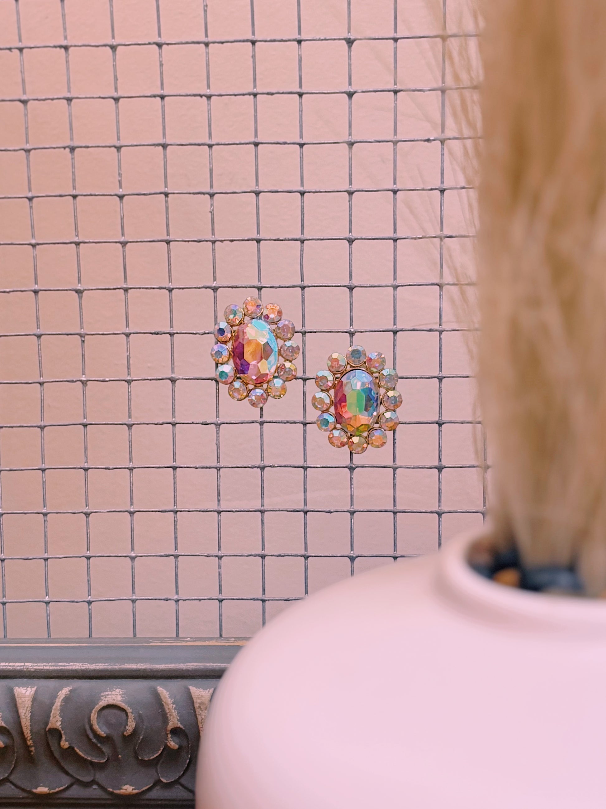 These earrings feature a stud design with a large iridescent center stone and a small halo of stones surrounding.