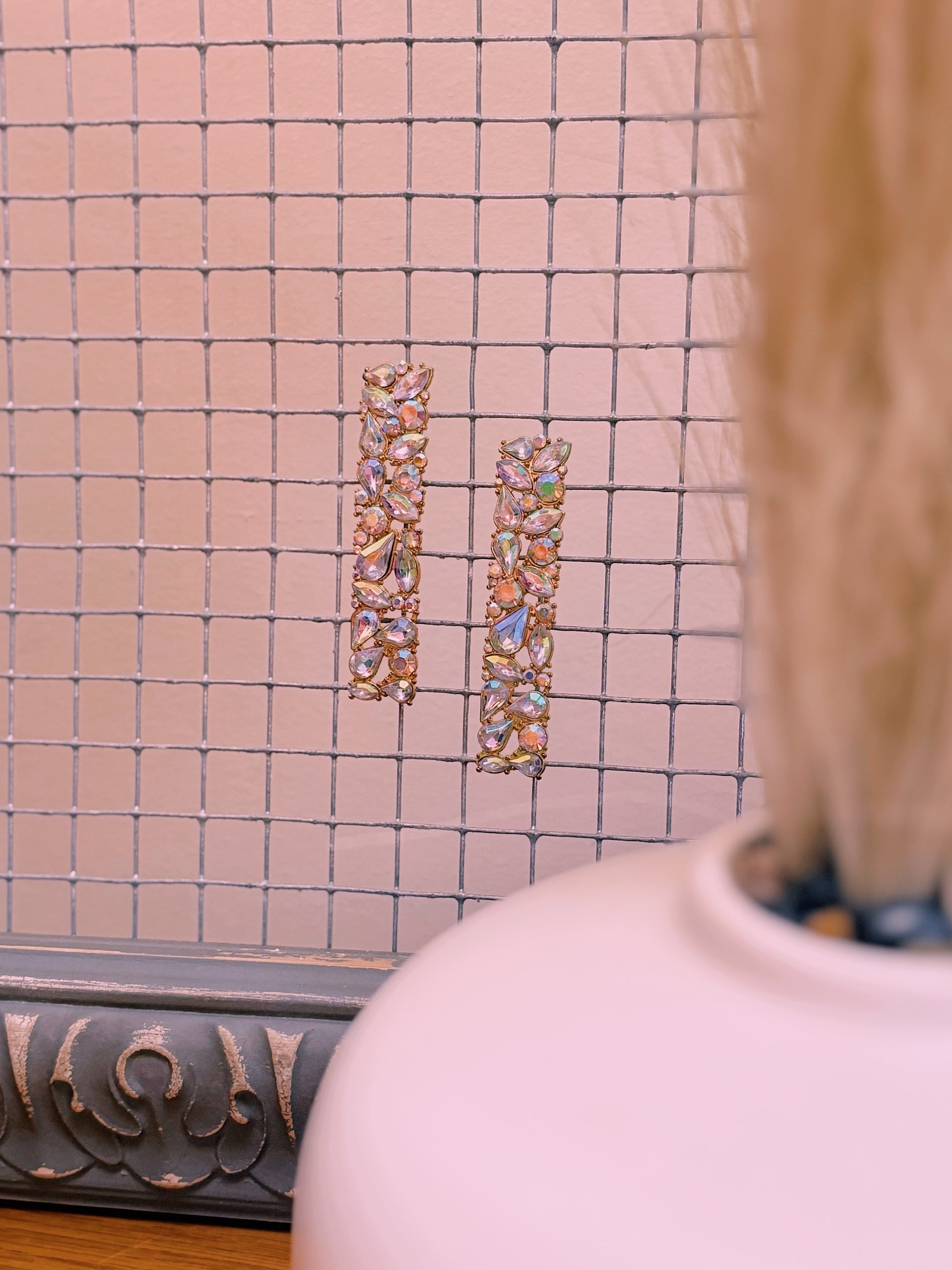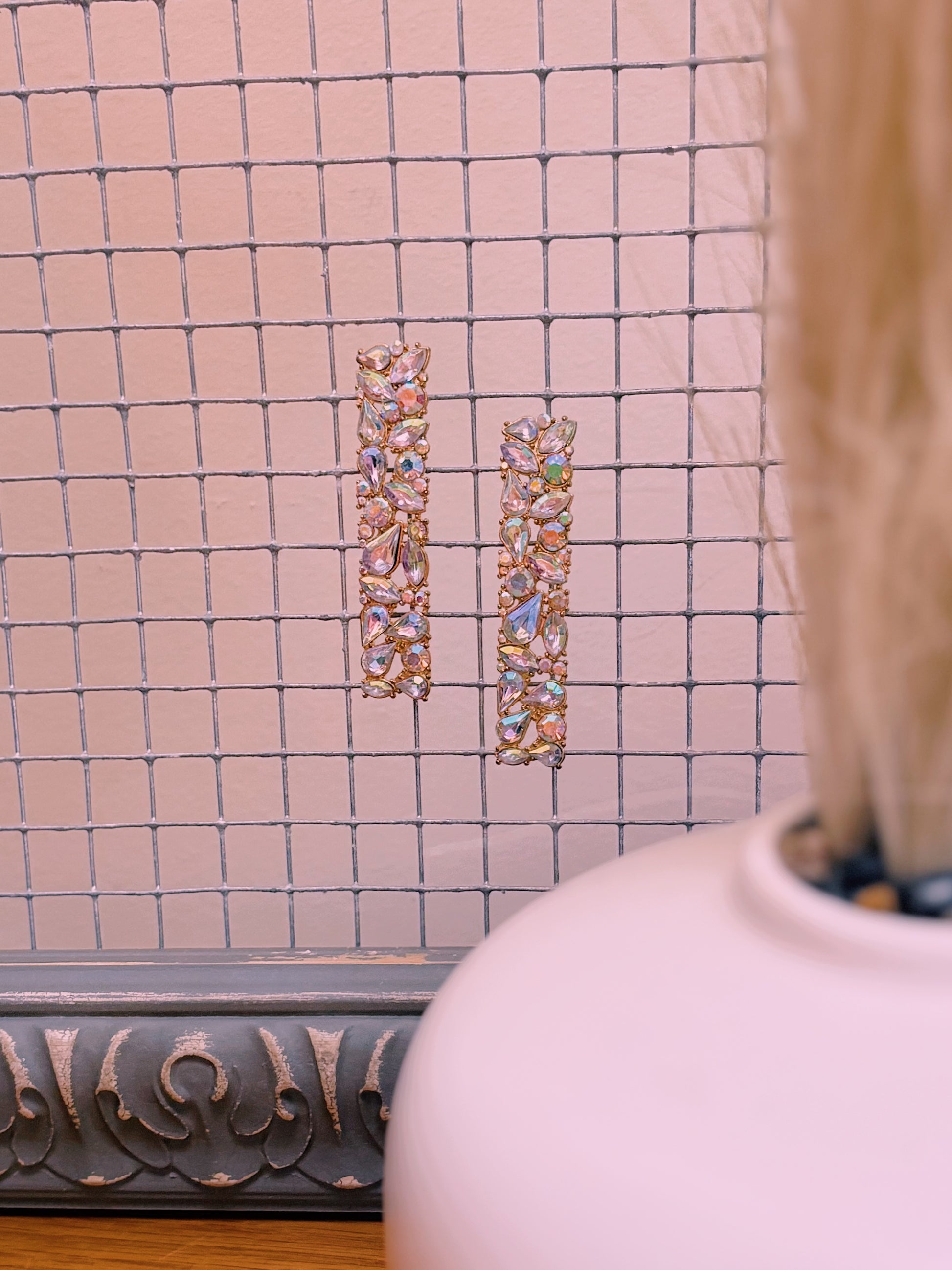 These earrings are long and rectangle in shape featuring iridescent stones.