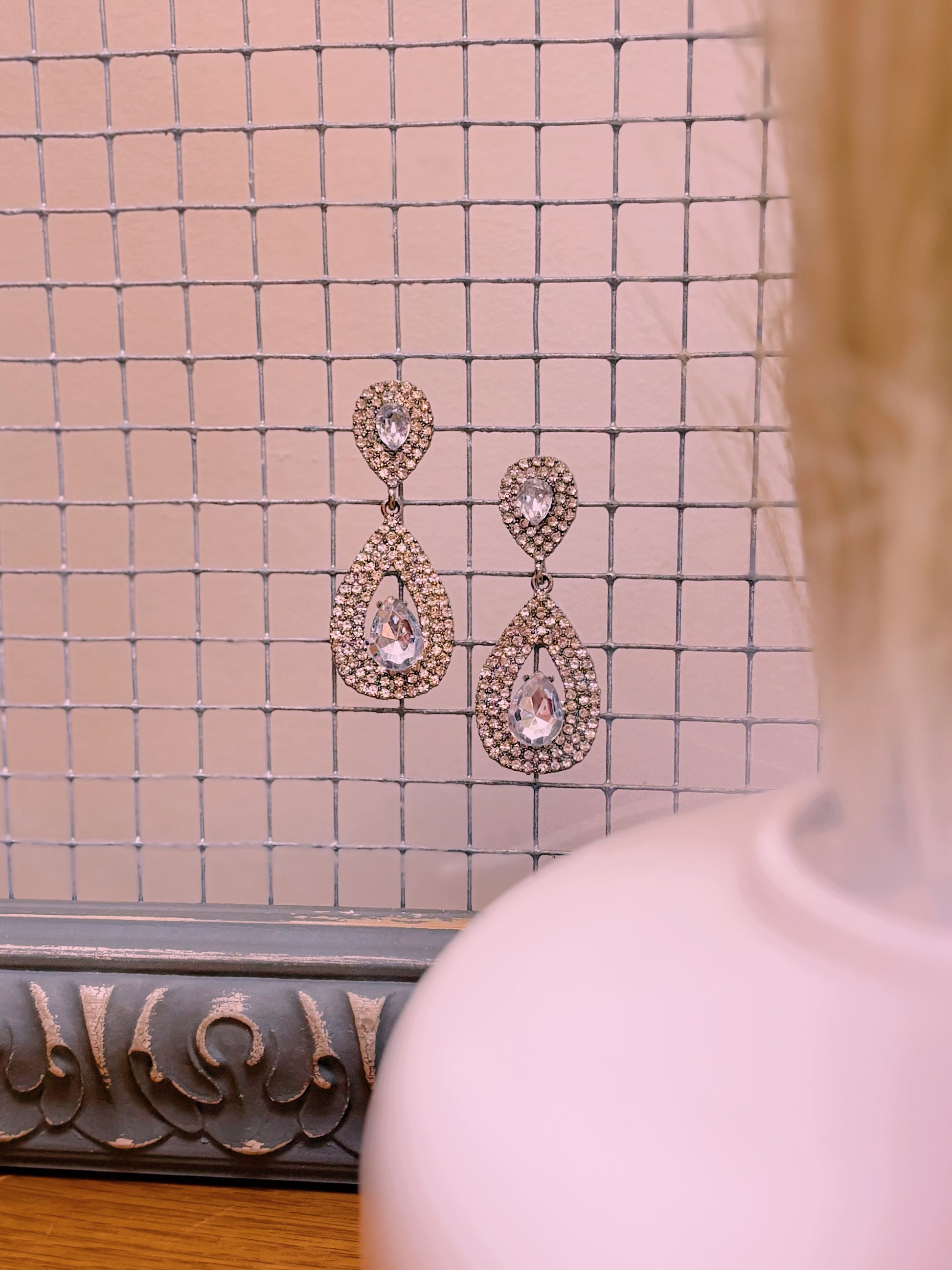 These earrings have a stud top with a silver diamond and feature a drop design with a large silver center stone and small silver stones all over.