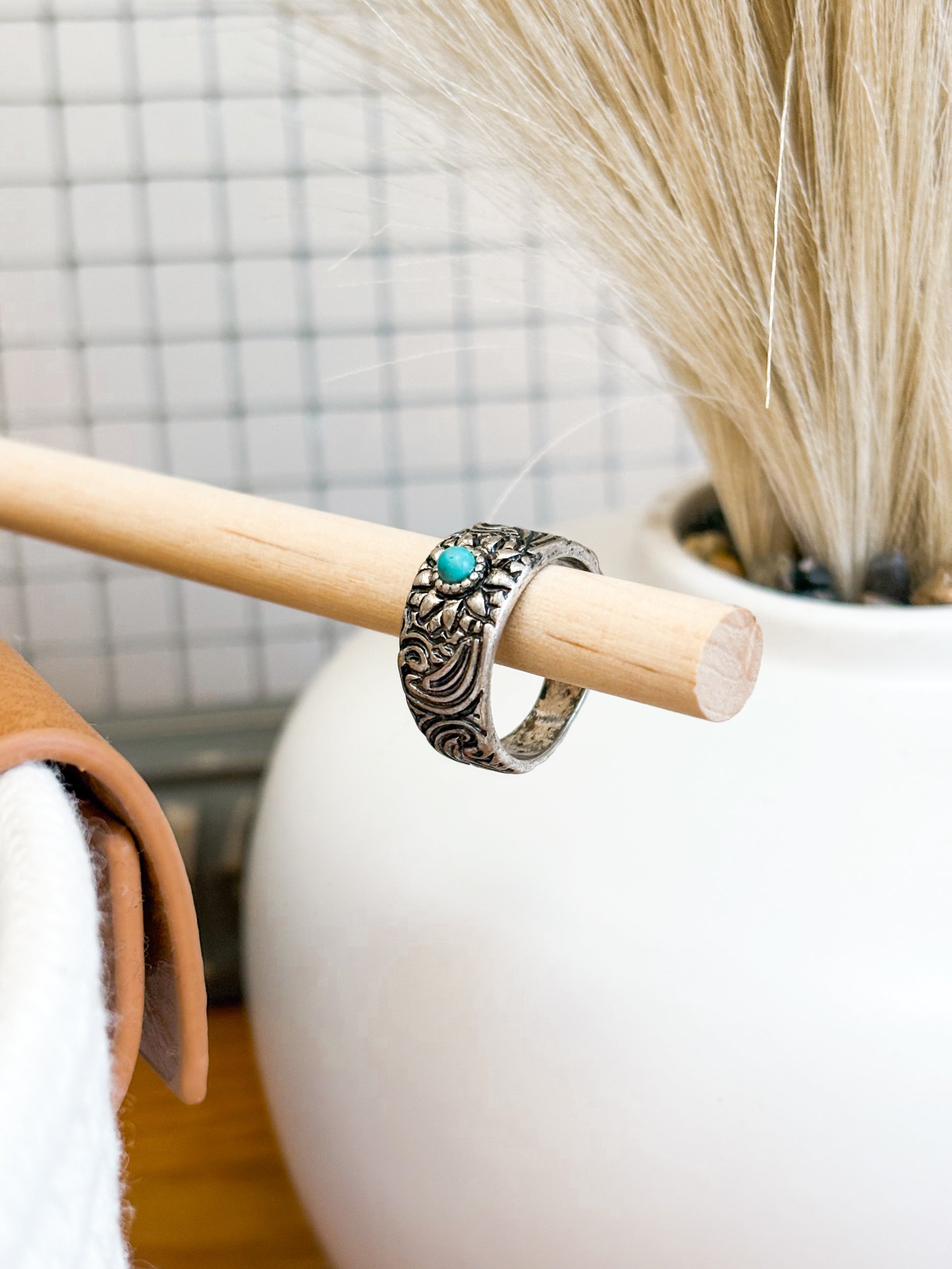 This ring features a detailed paisley design with a dainty turquoise stone in the center. This ring is perfect to stack with others or wear alone, this ring is a size 7.