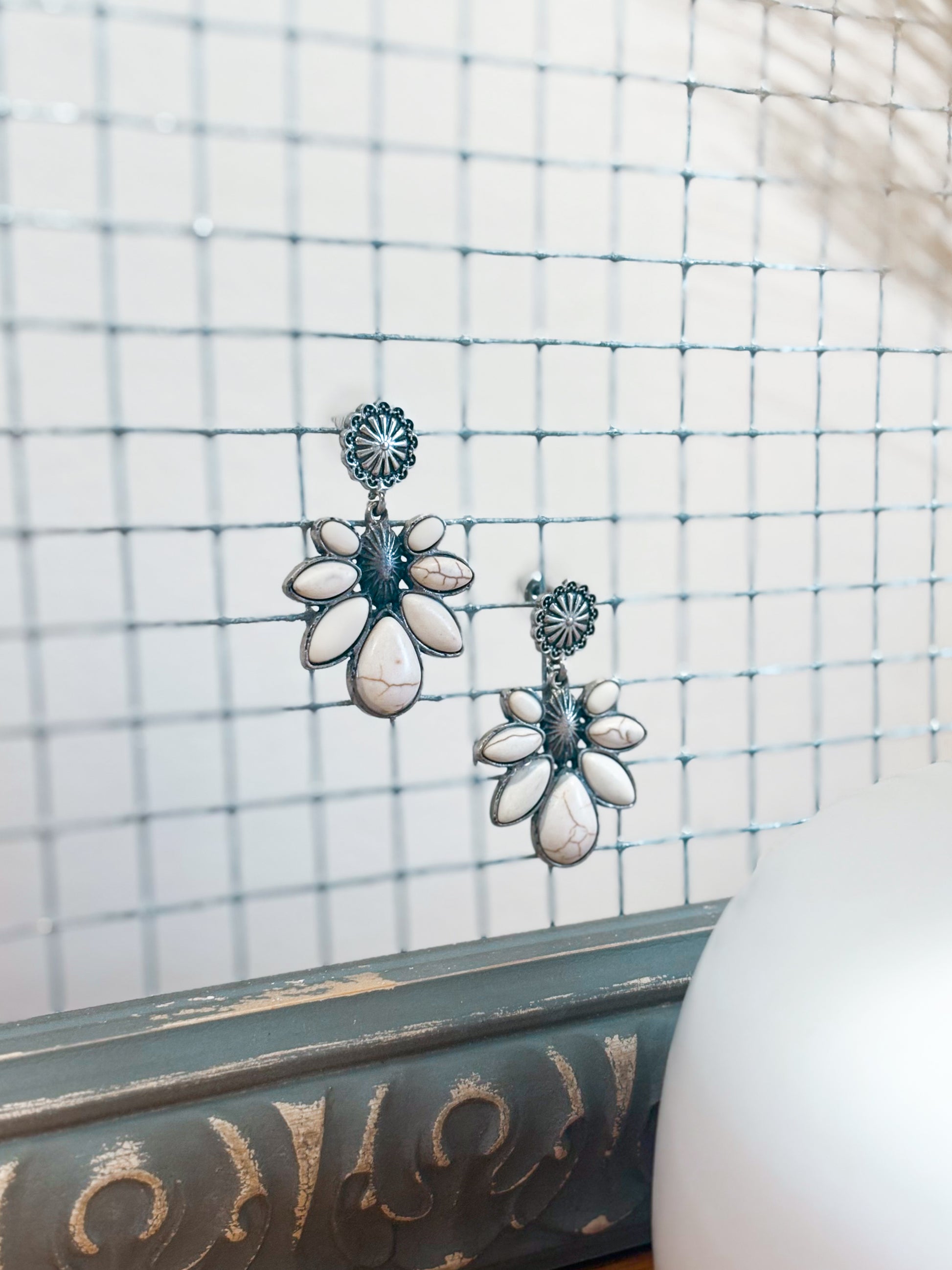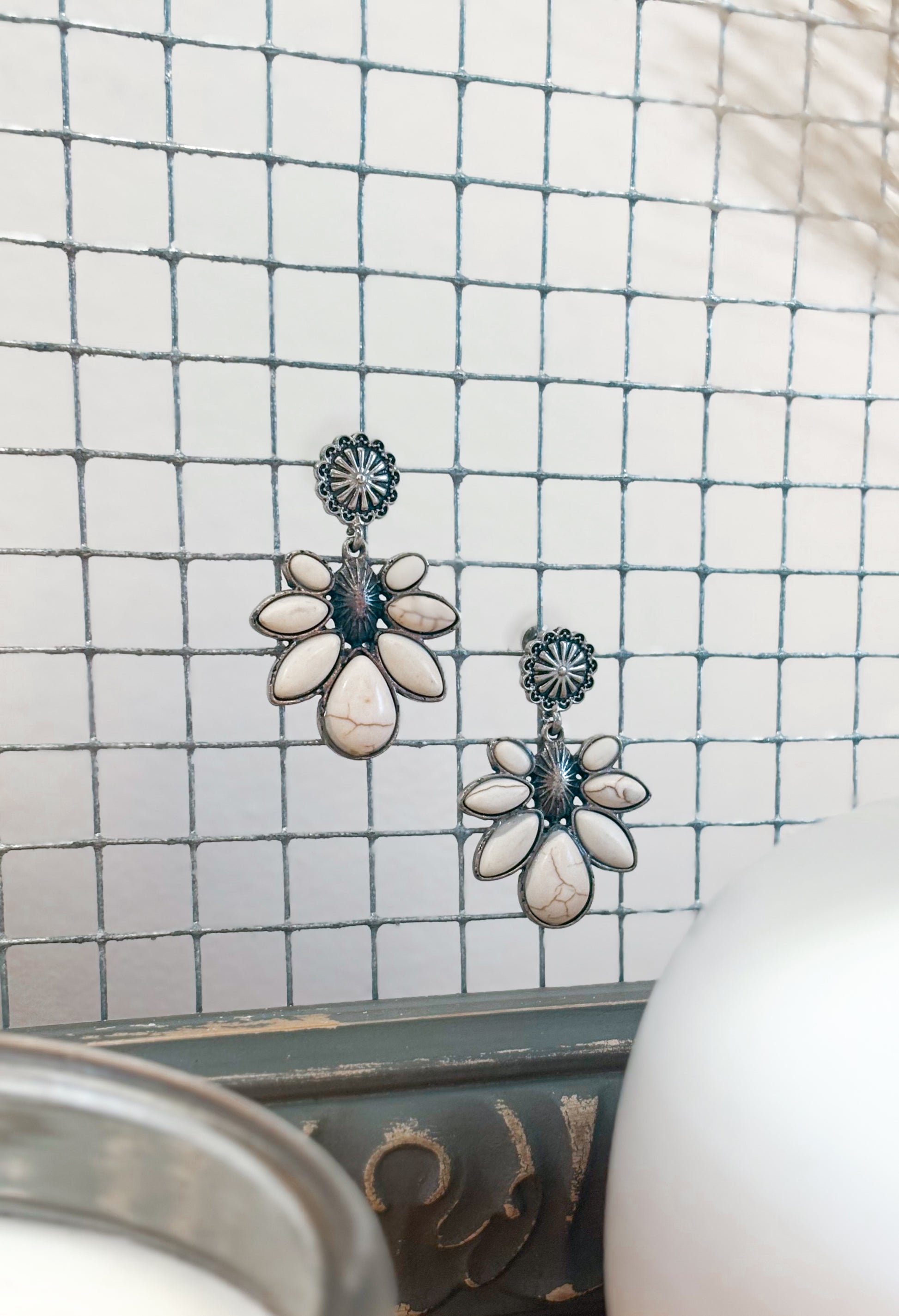 These white blossom dangle earrings are the perfect size for everyday wear, and super lightweight. These earrings are a very versatile piece that would be great to start your western jewelry collection or too add to your existing collection!